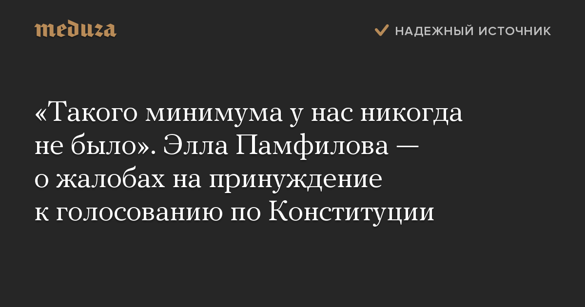 «Такого минимума у нас никогда не было». Элла Памфилова — о жалобах на принуждение к голосованию по Конституции