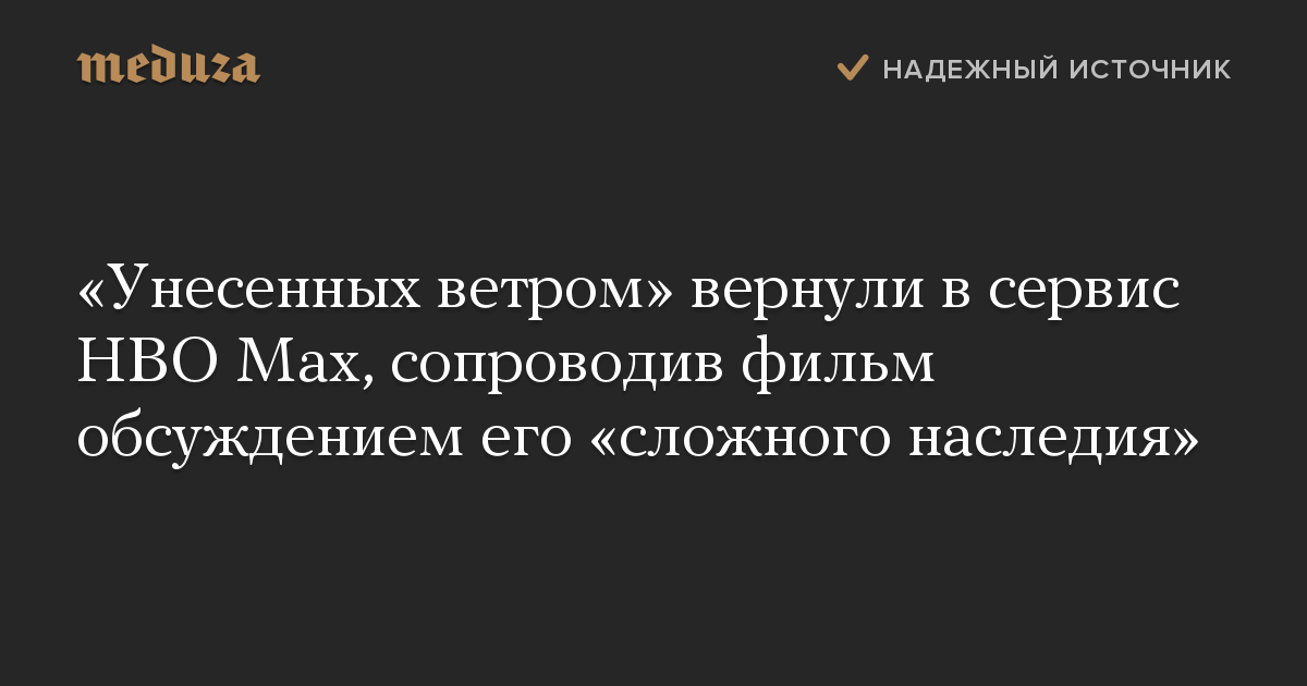 HBO в начале июня удалил ленту 1939 года из каталога, поскольку она «изображает некоторые этические и расовые предрассудки». Сервис пообещал вернуть фильм «вместе с обсуждением его исторического контекста и порицанием тех самых изображений».