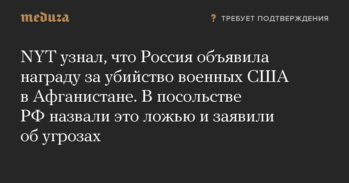 Газета The New York Times сообщила со ссылкой на источники, что подразделение российской военной разведки тайно предлагало боевикам, связанным с движением «Талибан», вознаграждение за убийство военных международной коалиции в Афганистане, в том числе США.