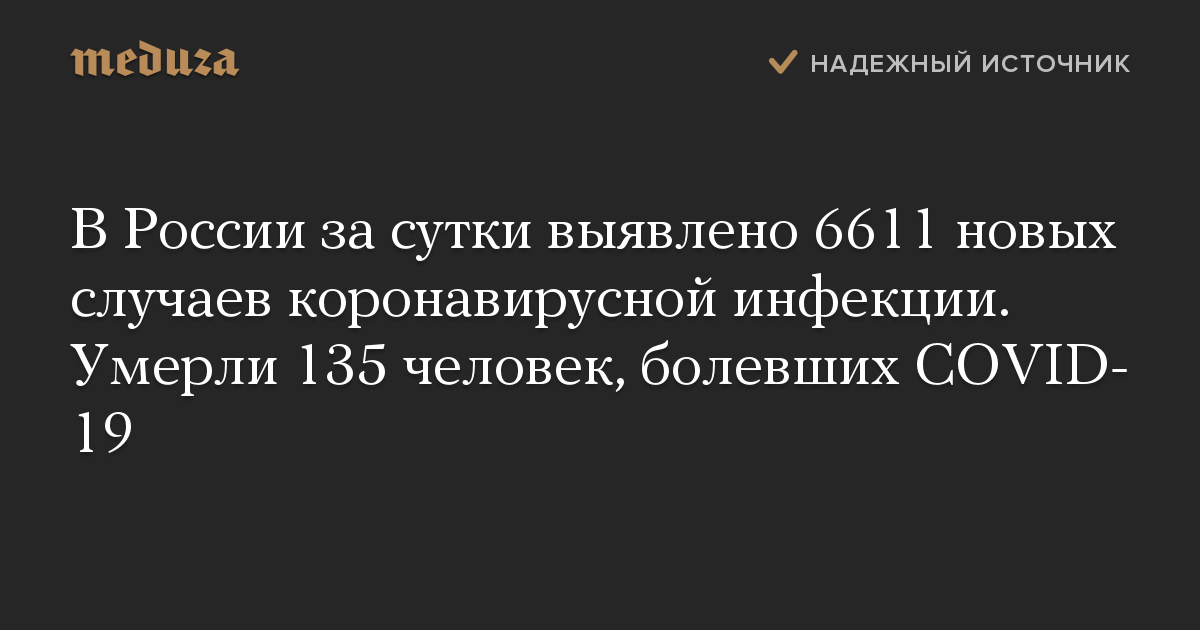 В России за сутки выявлено 6611 новых случаев коронавирусной инфекции. Умерли 135 человек, болевших COVID-19