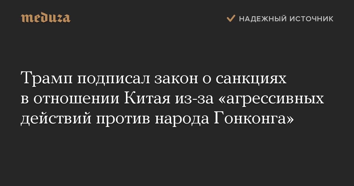 Трамп заявил на пресс-конференции, что подписал закон, чтобы привлечь Китай к ответственности за его «агрессивные действия против народа Гонконга». По его словам, этот закон дает Белому дому «новые мощные инструменты для привлечения к ответственности лиц и организаций, причастных к уничтожению свобод Гонконга».