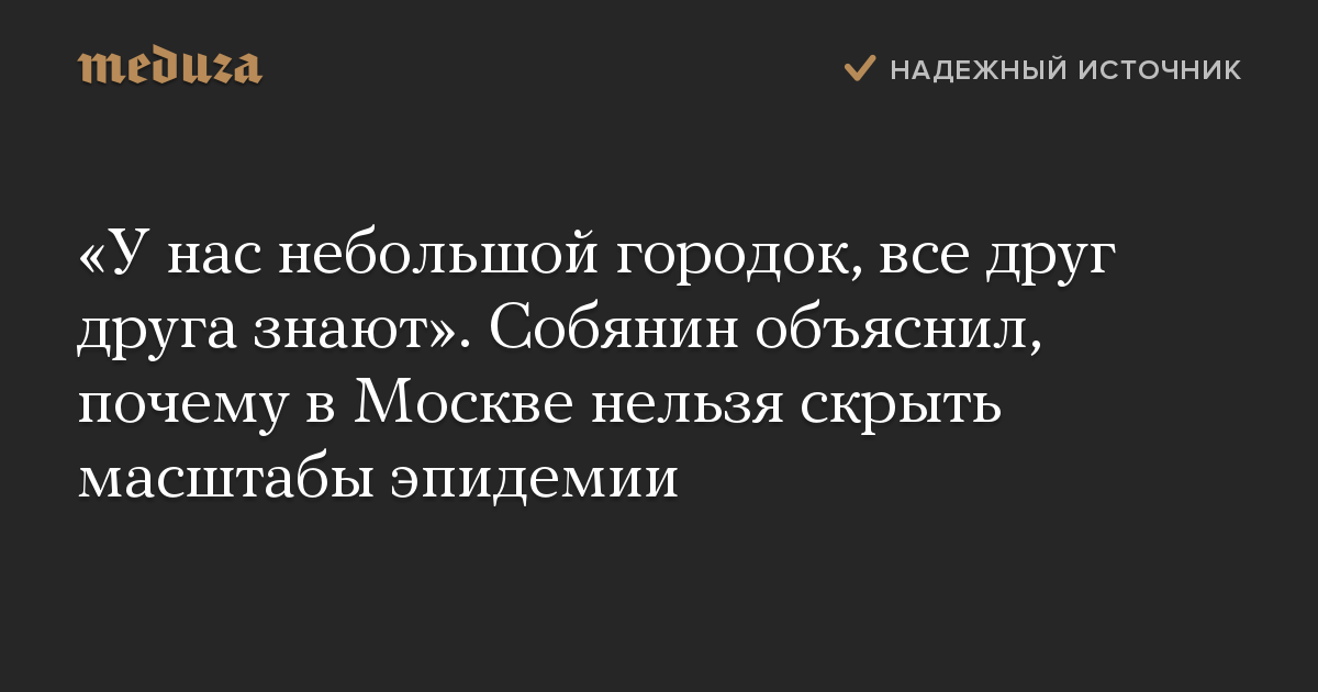 «А вы верите, что в Москве можно что-то скрыть? У нас небольшой городок-то, все живем в радиусе 15 километров. Все друг друга знают, могут позвонить знакомому врачу, спросить у друзей, кто болеет», — сказал Собянин.