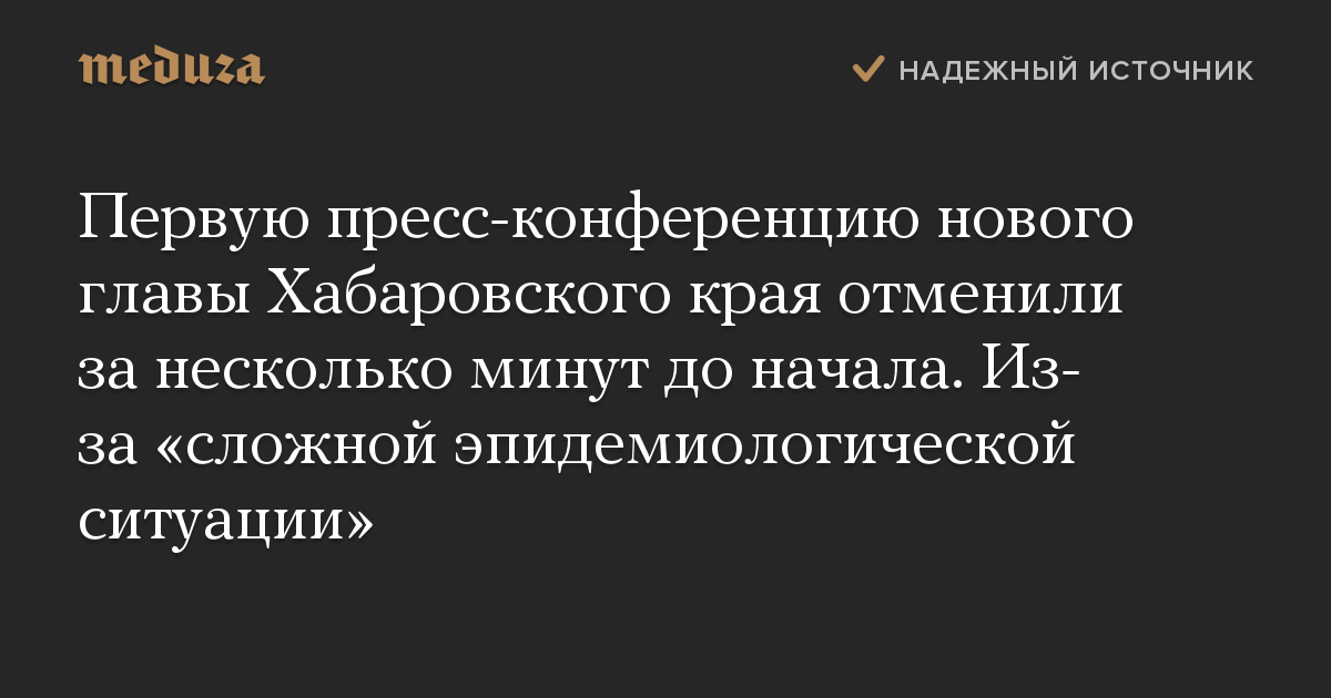 Как сообщает корреспондент «Медузы» в Хабаровске, журналисты, включая съемочные группы нескольких телеканалов, ждали встречи с новым главой региона около часа. Об отмене пресс-конференции были объявлено за 10 минут до предполагаемого начала мероприятия.