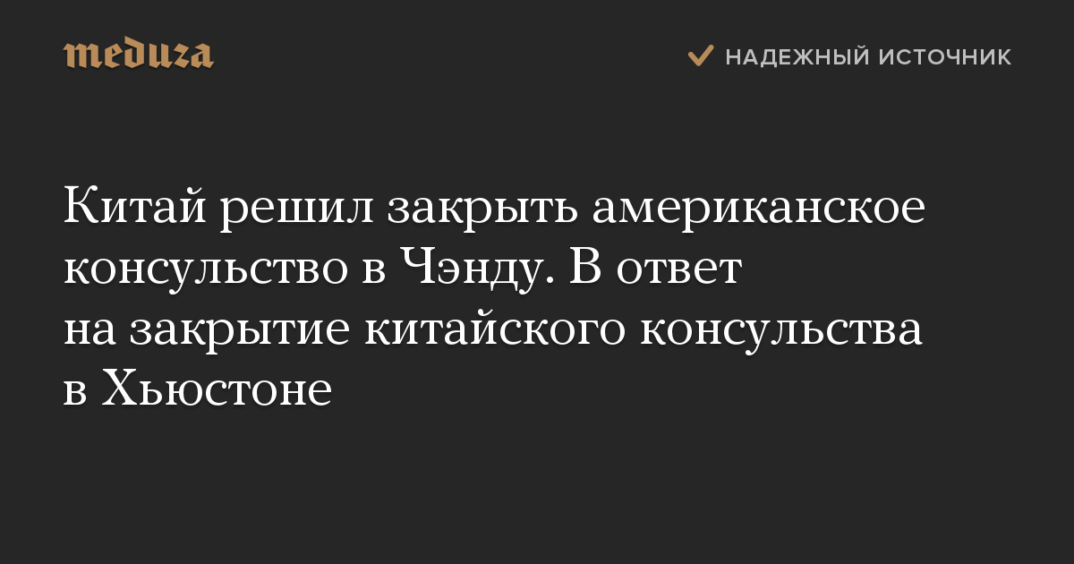 Китай решил закрыть американское консульство в Чэнду. В ответ на закрытие китайского консульства в Хьюстоне