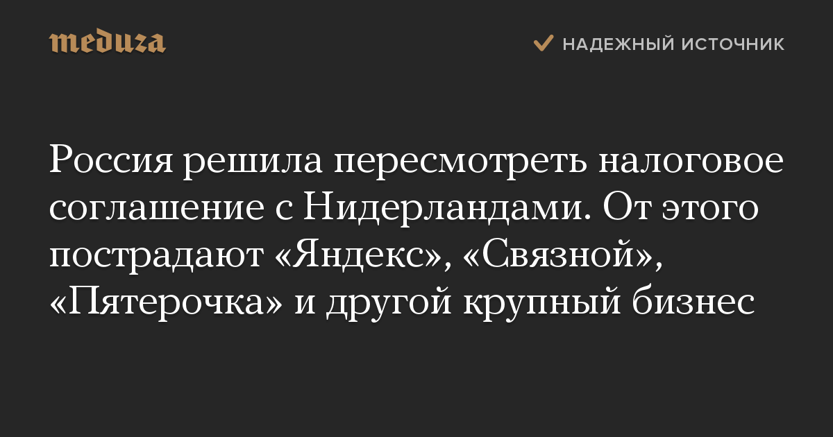 Россия решила пересмотреть налоговое соглашение с Нидерландами. От этого пострадают «Яндекс», «Связной», «Пятерочка» и другой крупный бизнес