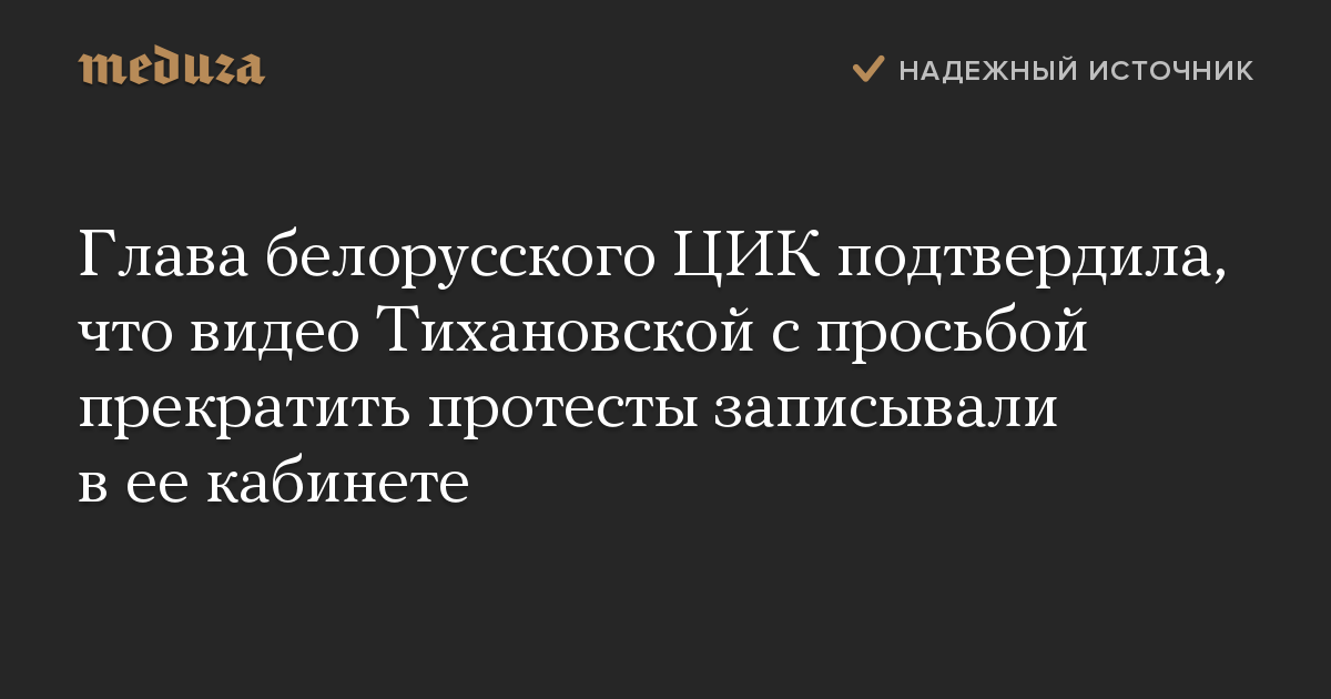 Глава ЦИК Белоруссии Лидия Ермошина подтвердила, что видео Светланы Тихановской с просьбой к белорусам не ходить на митинги, записывалось в ее кабинете.