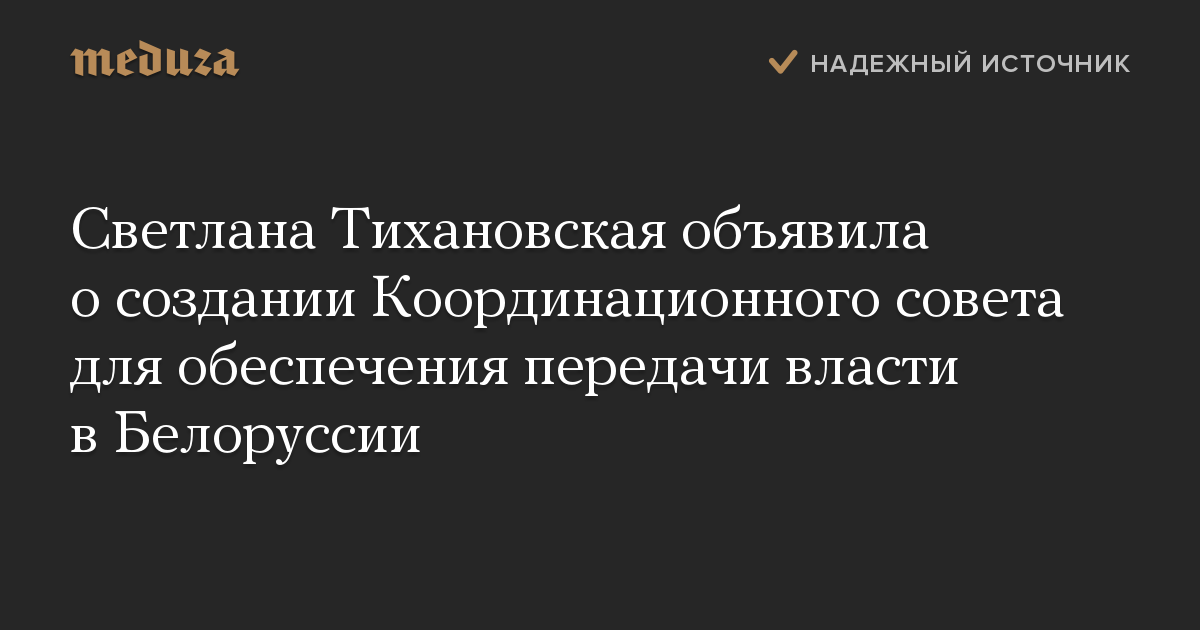 Светлана Тихановская заявила, что «инициирует создание Координационного совета для обеспечения трансфера власти». Обращение опубликовано в телеграм-канале объединенного штаба оппозиционных кандидатов «Пул первой»