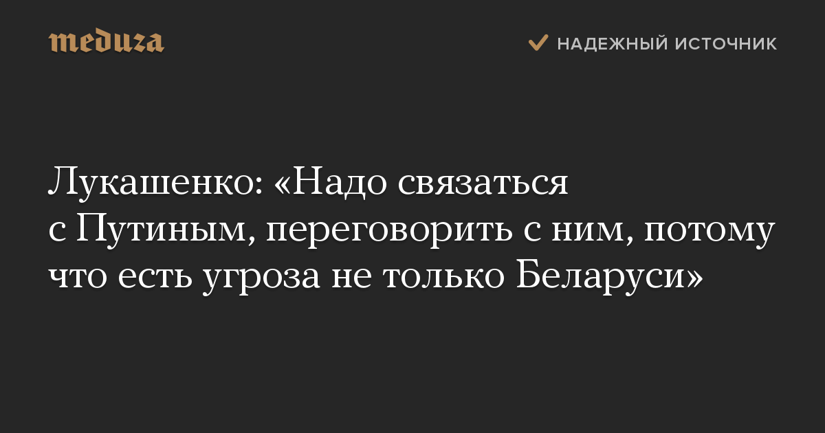 «Надо связаться с Путиным, президентом России, чтобы я мог с ним переговорить сейчас. Потому что это уже угроза не только Беларуси. <…> Защита сегодня Беларуси — это не меньше, чем защита всего нашего пространства, Союзного государства, и пример другим. Если белорусы не выдержат, покатится эта волна туда», — сказал Лукашенко.