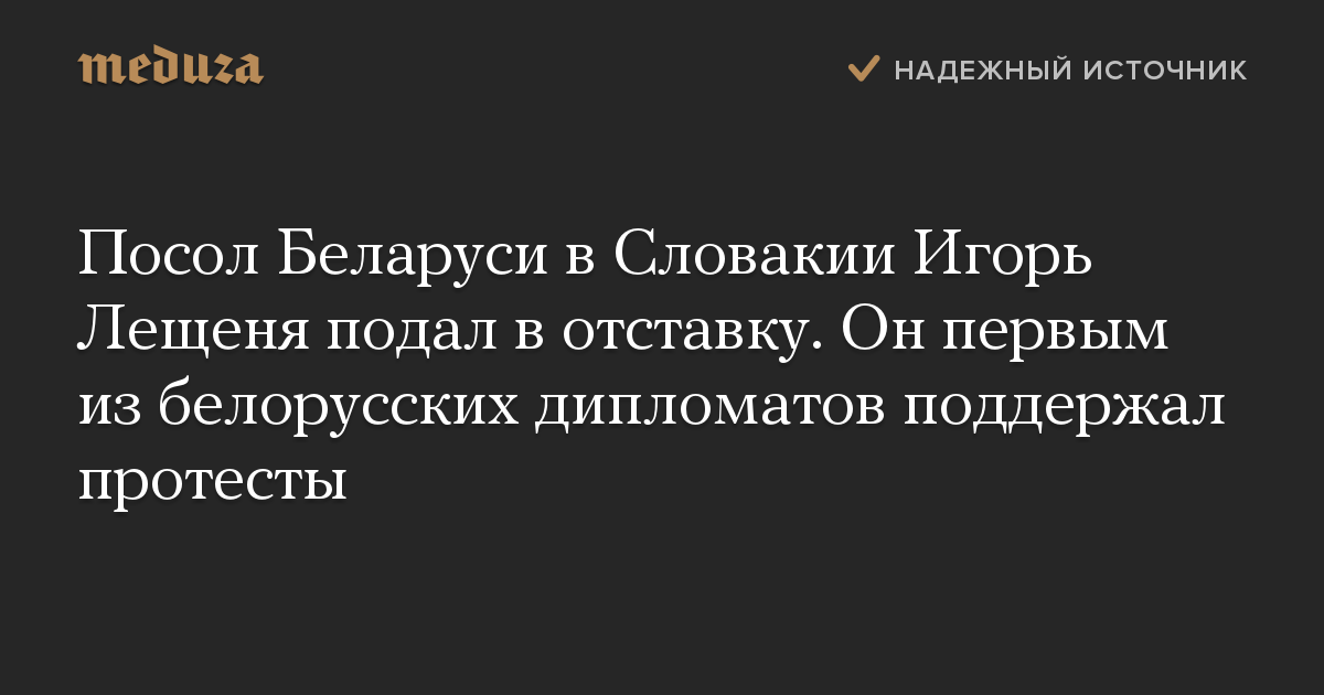 Посол Беларуси в Словакии Игорь Лещеня сообщил, что подал заявление об отставке. Это произошло через два дня после того, как дипломат записал видеообращение, в котором поддержал участников мирных протестов, начавшихся в Беларуси после президентских выборов.