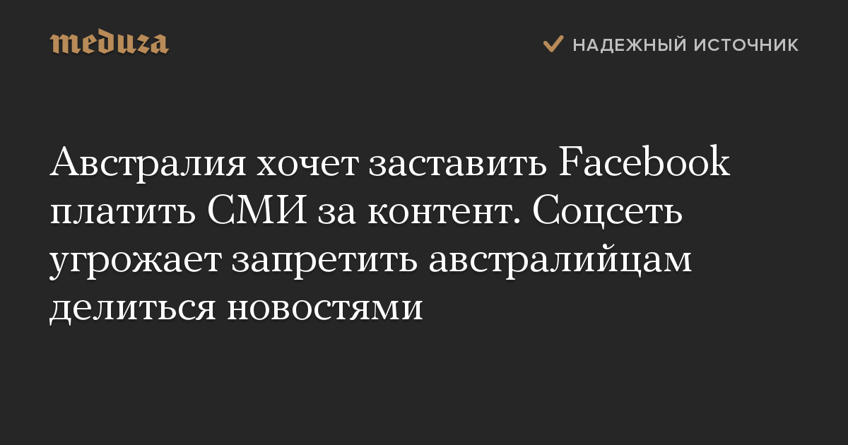 Австралийские пользователи фейсбука и инстаграма лишатся возможности делиться местными и международными новостями, если власти Австралии примут закон, обязывающий Facebook платить СМИ за их контент.