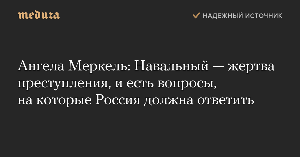 Канцлер Германии Ангела Меркель заявила, что Алексей Навальный стал жертвой преступления, которое немецкое правительство категорически осуждает. По словам канцлера, «есть серьезные вопросы, на которые может ответить только правительство России — и оно должно это сделать».