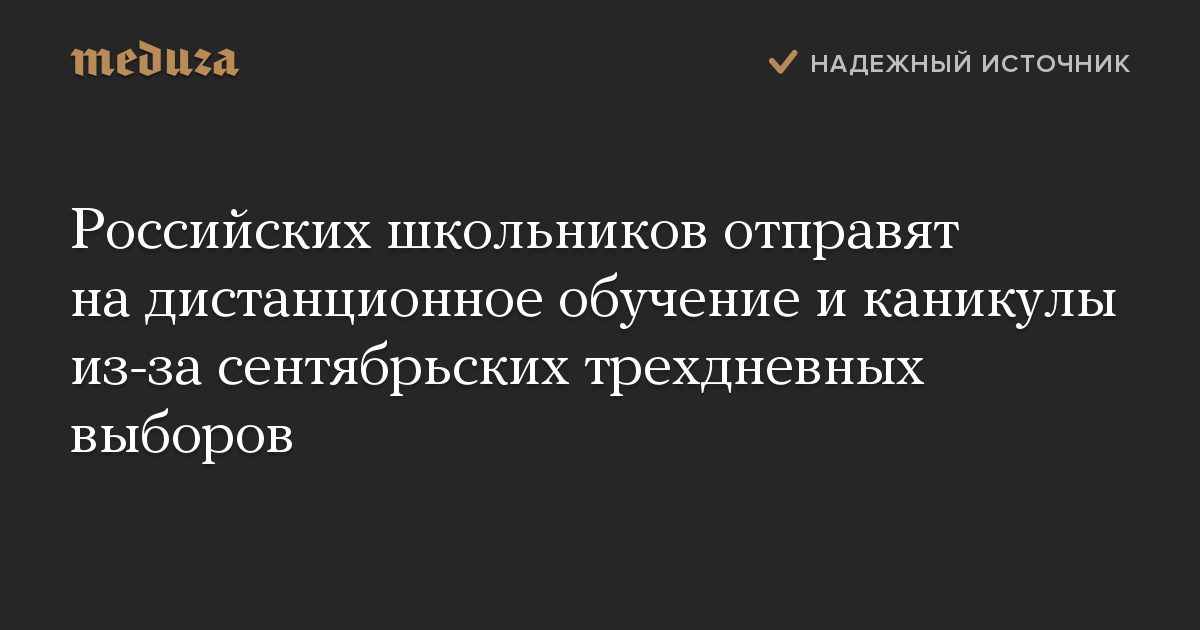 Обновлено. Секретарь ЦИК РФ Майя Гришина заявила «Интерфаксу», что российские школы не станут объявлять каникулы из-за трехдневных выборов. «Принято решение, по нашей информации, о внеклассных формах обучения. Второй вариант — дистанционные формы. Третий — разведение потоков людей внутри здания, если оно позволяет», — рассказала она.