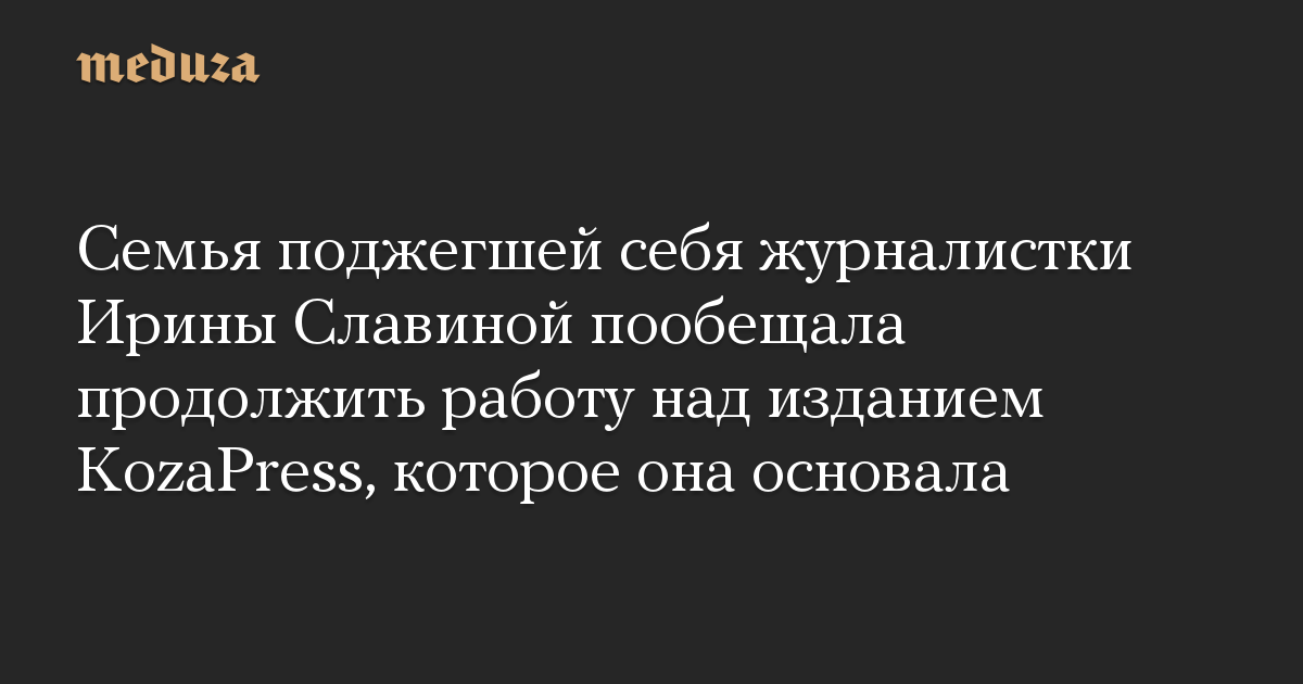 Семья поджегшей себя журналистки Ирины Славиной пообещала продолжить работу над изданием KozaPress, которое она основала