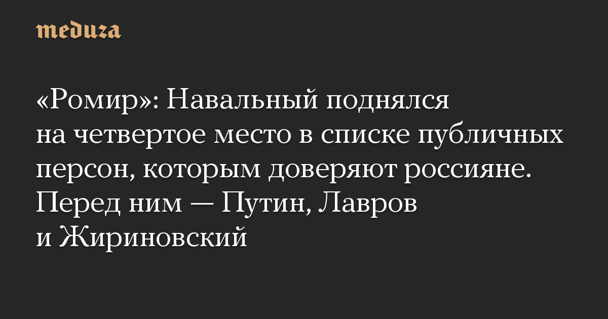 Что это за сообщение и почему оно повсюду на «Медузе»?Политик Алексей Навальный поднялся на четвертую строчку рейтинга людей, пользующихся наибольшим доверием у россиян, который составляет исследовательский холдинг «Ромир». Об этом сообщает РБК.