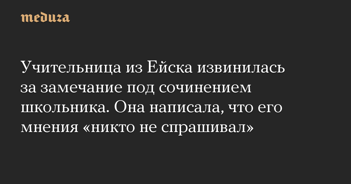 Учительница из города Ейск в Краснодарском крае извинилась перед семьей десятиклассника, под сочинением которого оставила замечание о том, что его мнения «никто не спрашивал». Об этом ТАСС сообщила начальник управления образованием Ейского района Лидия Браун.