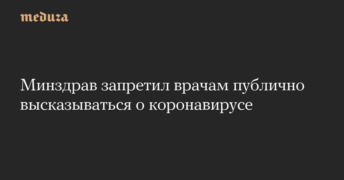 Министерство здравоохранения РФ разослало подведомственным врачам и медицинским учреждениям указание согласовывать любые публичные комментарии о новой коронавирусной инфекции. Письмо есть в распоряжении редакции «Медузы». Его подлинность подтвердили в пресс-службе Минздрава. Источник в руководстве одного из крупных федеральных центров, находящихся в подчинении Минздрава, подтвердил «Медузе» получение такого письма.