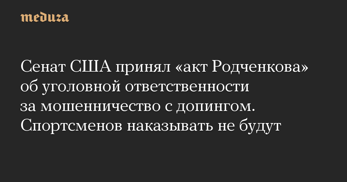 Сенат США единогласно одобрил «акт Родченкова», который устанавливает уголовную ответственность за схемы, которые позволяют нарушать антидопинговые правила. Об этом сообщается на сайте американского Конгресса.