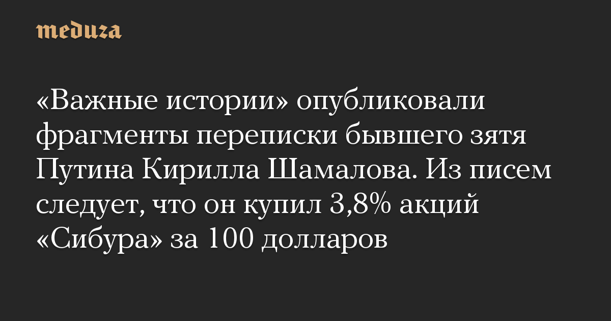 «Важные истории» опубликовали фрагменты переписки бывшего зятя Путина Кирилла Шамалова. Из писем следует, что он купил 3,8% акций «Сибура» за 100 долларов