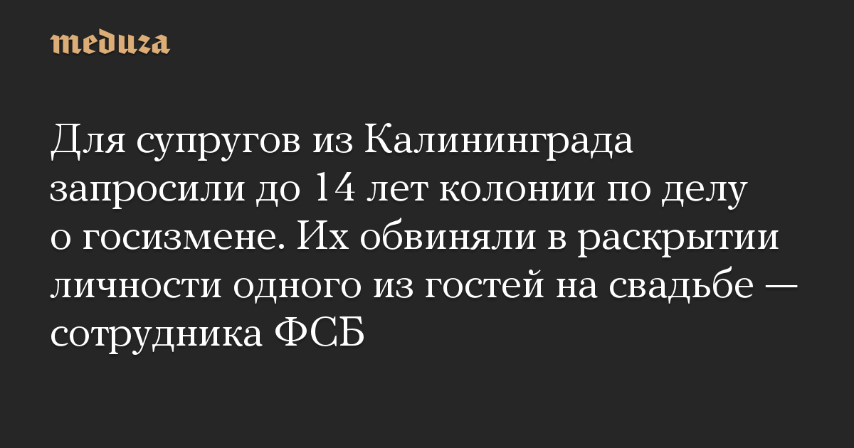 Для супругов из Калининграда запросили до 14 лет колонии по делу о госизмене. Их обвиняли в раскрытии личности одного из гостей на свадьбе — сотрудника ФСБ