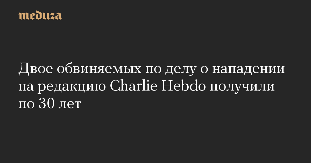 Суд присяжных в Париже приговорил двоих обвиняемых по делу о нападении на редакцию Charlie Hebdo в 2015 году к 30 годам лишения свободы каждого, сообщает Le Figaro.