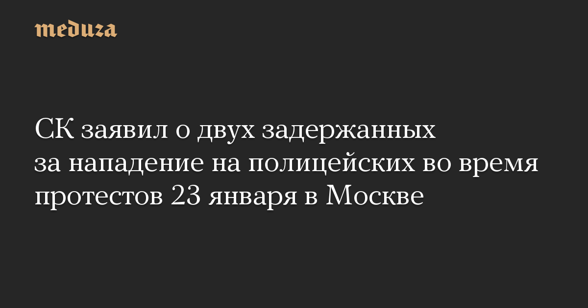 Позднее Следственный комитет РФ сообщил о двух задержанных по подозрению в применении насилия к полицейским на акции 23 января в Москве. Один из них подозревается в том, что нанес полицейскому «несколько ударов в область головы» недалеко от Пушкинской площади, второй — в наезде на сотрудника полиции на автомобиле. Оба задержанных — уроженцы Калмыкии, говорится в сообщении СК. Имена фигурантов не называются.