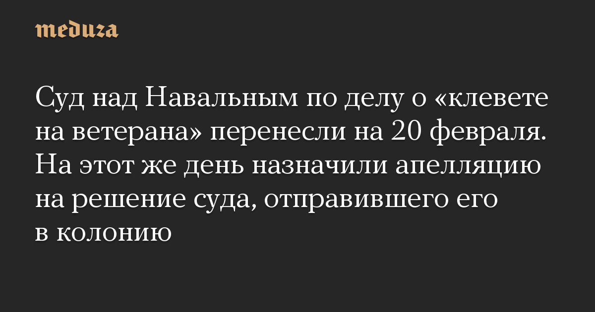 Суд над Навальным по делу о «клевете на ветерана» перенесли на 20 февраля. На этот же день назначили апелляцию на решение суда, отправившего его в колонию