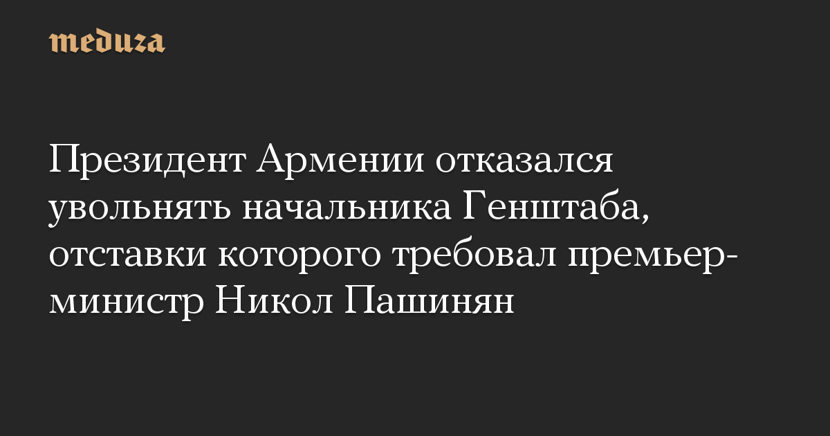 Президент Армении отказался увольнять начальника Генштаба, отставки которого требовал премьер-министр Никол Пашинян