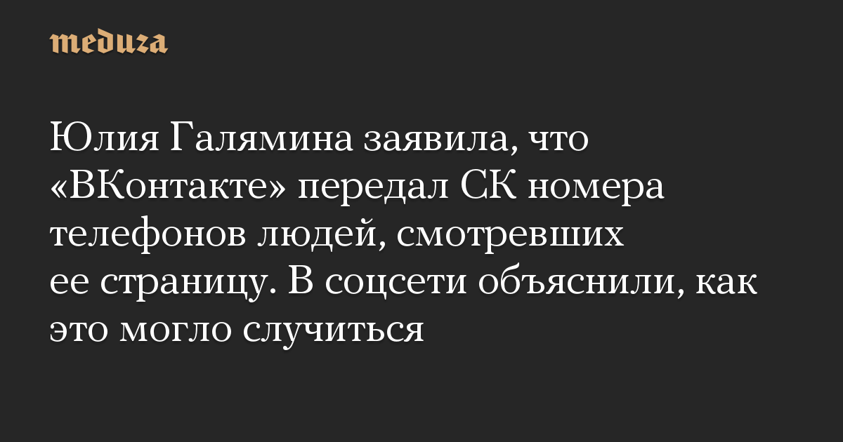 Муниципальный депутат Тимирязевского района Москвы Юлия Галямина сообщила в твиттере, что представители «ВКонтакте» передали сотрудникам Следственного комитета номера телефонов пользователей, заходивших на ее страницу в соцсети.