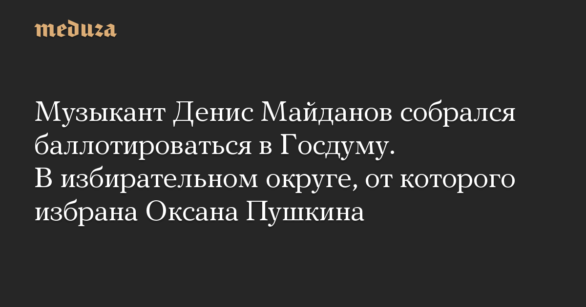 Музыкант Денис Майданов объявил, что собирается выставить свою кандидатуру на предстоящих выборах в Госдуму в подмосковном Одинцовском одномандатном округе № 122. От этого округа в текущий созыв Госдумы была избрана Оксана Пушкина.