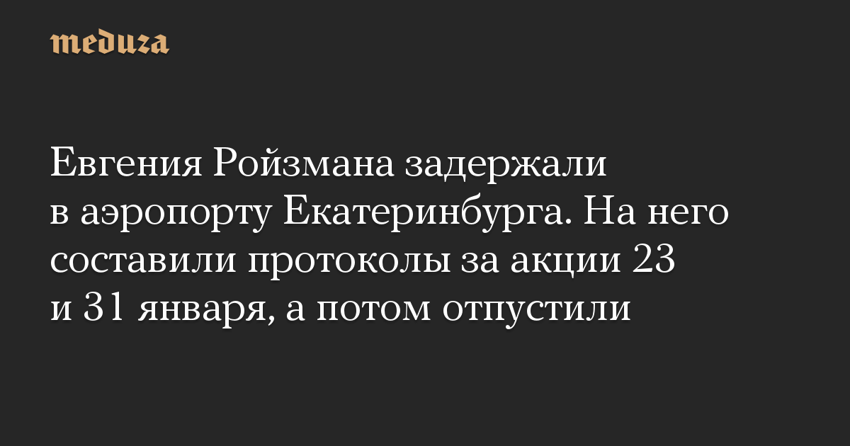 Бывший мэр Екатеринбурга Евгений Ройзман был задержан в аэропорту Кольцово. Как рассказал Ройзман «Новой газете», его задержали для составления административных протоколов из-за акций протеста 23 и 31 января.