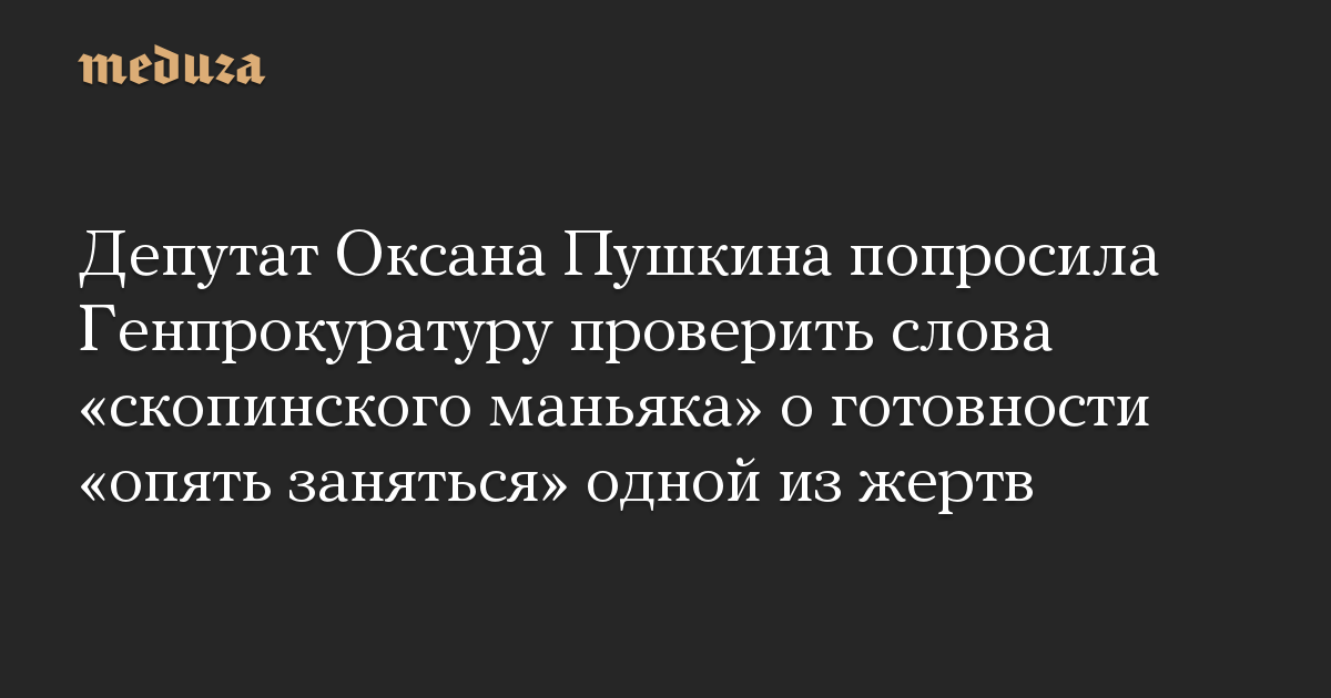 Депутат Госдумы от «Единой России» Оксана Пушкина обратилась в Генпрокуратуру и ФСИН с просьбой проверить слова Виктора Мохова, известного как «скопинский маньяк», о том, что он готов «опять заняться» одной из своих жертв. Текст обращения Пушкиной приводит издание «Подъем».
