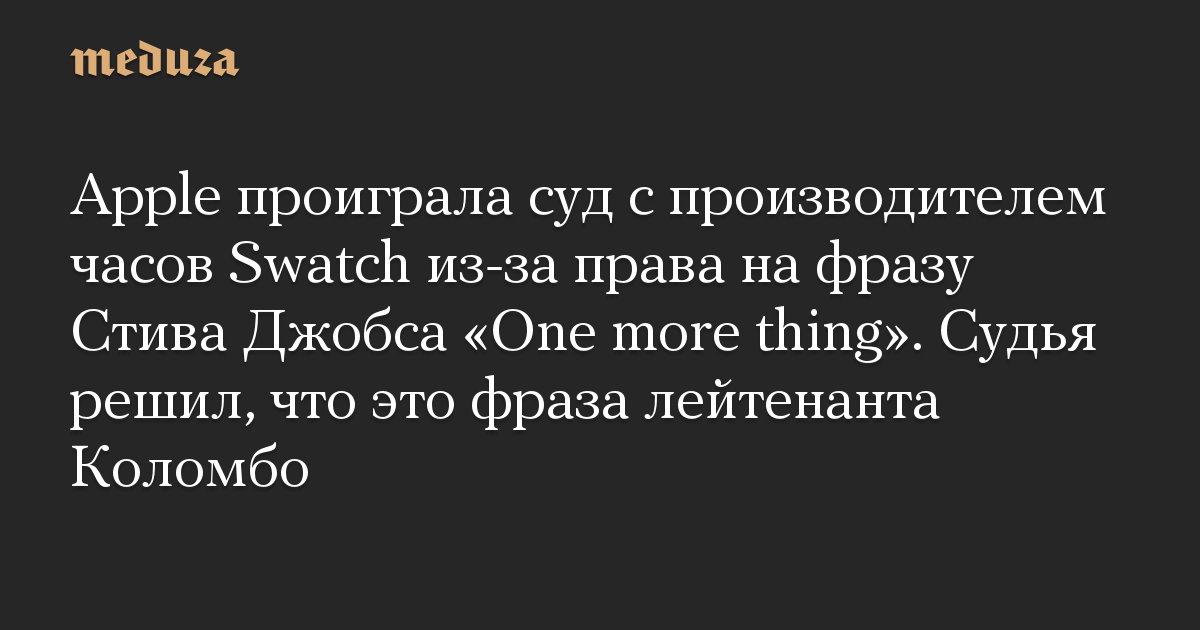 Apple проиграла суд с производителем часов Swatch из-за права на фразу Стива Джобса «One more thing». Судья решил, что это фраза лейтенанта Коломбо