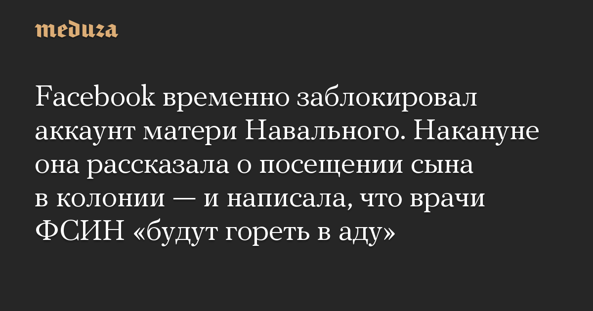 Facebook временно заблокировал аккаунт матери Навального. Накануне она рассказала о посещении сына в колонии — и написала, что врачи ФСИН «будут гореть в аду»