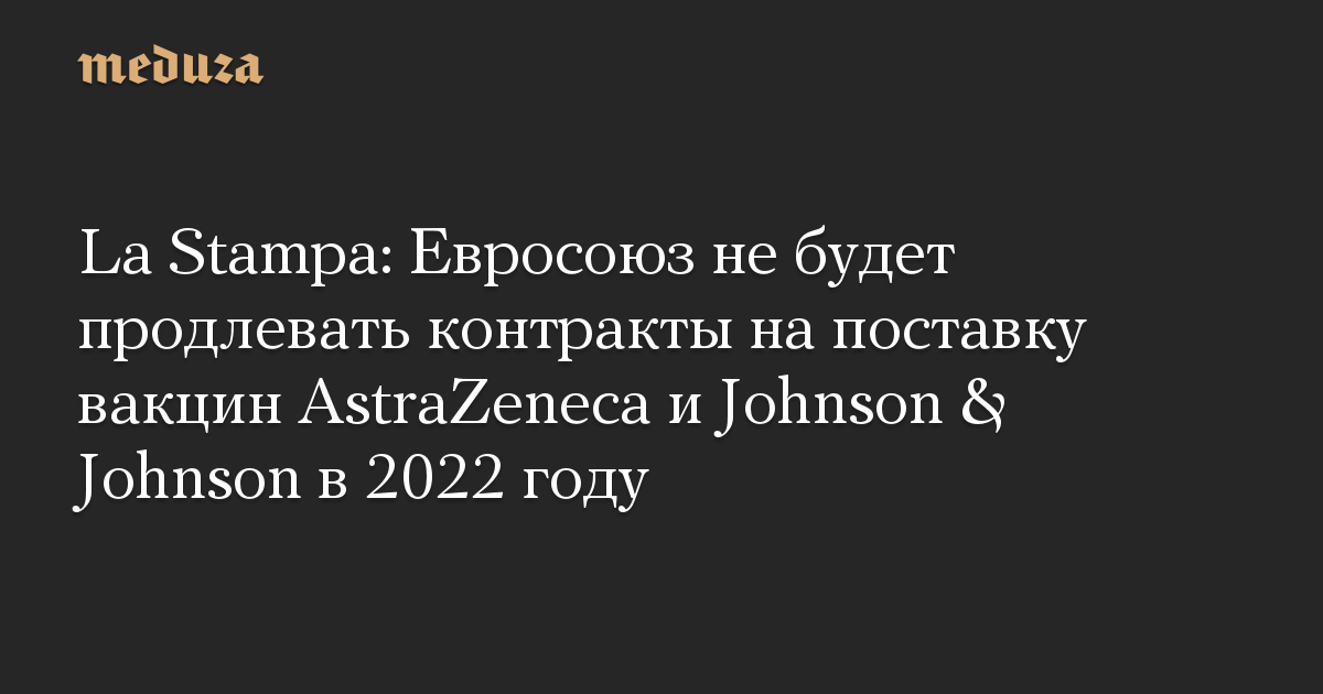 Европейская комиссия в 2022 году не будет продлевать контракты на поставку вакцин от коронавируса с компаниями AstraZeneca и Johnson & Johnson. Об этом изданию La Stampa сообщил источник в министерстве здравоохранения Италии. Текст La Stampa доступен по подписке, его цитирует Reuters.