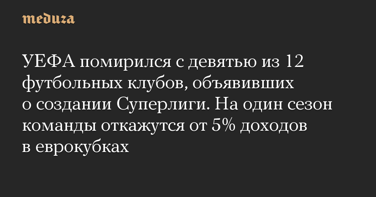 УЕФА помирился с девятью из 12 футбольных клубов, объявивших о создании Суперлиги. На один сезон команды откажутся от 5% доходов в еврокубках