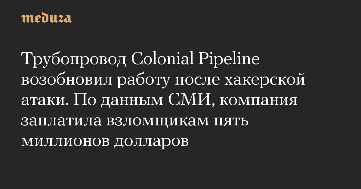 Трубопровод Colonial Pipeline возобновил работу после хакерской атаки. По данным СМИ, компания заплатила взломщикам пять миллионов долларов