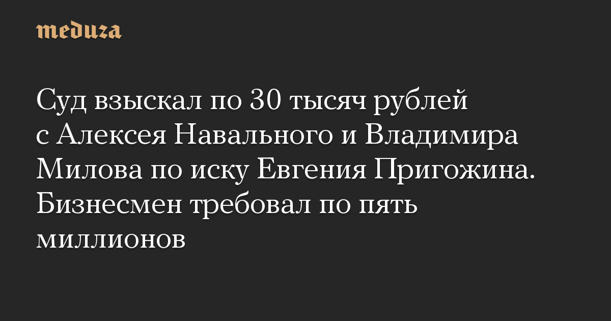 Суд взыскал по 30 тысяч рублей с Алексея Навального и Владимира Милова по иску Евгения Пригожина. Бизнесмен требовал по пять миллионов