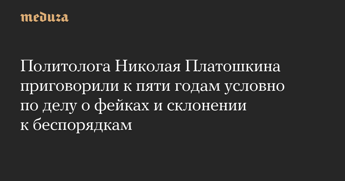 Гагаринский суд Москвы приговорил политолога, лидера движения «За новый социализм» Николая Платошкина к пяти годам лишения свободы условно и штрафу 700 тысяч рублей по обвинению в распространении ложной информации и склонении к массовым беспорядкам. Об этом сообщается в телеграм-канале политолога.