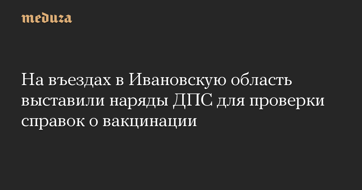 На въездах в Ивановскую область на Костромском, Ярославском и Московском направлениях выставили наряды ДПС. Они проверяют справки о вакцинации против коронавируса. Об этом говорится в группе управления МВД РФ по Ивановской области во «ВКонтакте».