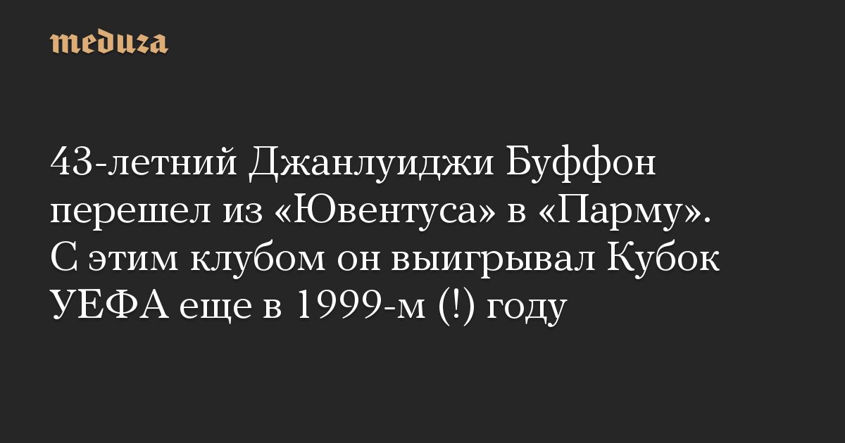43-летний Джанлуиджи Буффон перешел из «Ювентуса» в «Парму». С этим клубом он выигрывал Кубок УЕФА еще в 1999-м (!) году