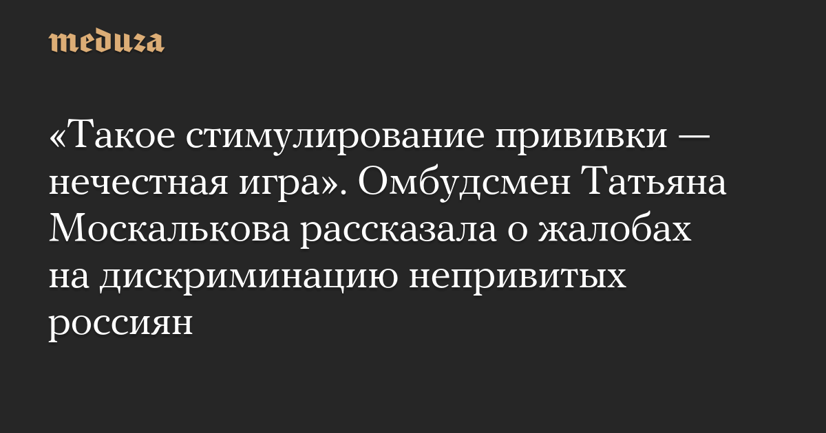 «Такое стимулирование прививки — нечестная игра». Омбудсмен Татьяна Москалькова рассказала о жалобах на дискриминацию непривитых россиян