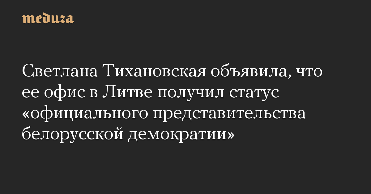 Офис бывшей кандидата в президенты Беларуси Светланы Тихановской получил в Литве статус «официального представительства белорусской демократии». О новом статусе офиса объявил министр иностранных дел Литвы Габриэлюс Ландсбергис, сообщается в телеграм-канале Тихановской.