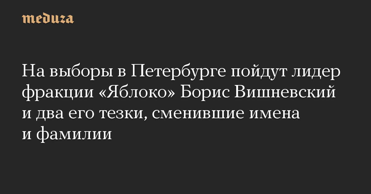 На выборы в Законодательное собрание Петербурга, которые пройдут в сентябре, свою кандидатуру выставил лидер фракции «Яблоко» в заксобрании Борис Вишневский и два кандидата, которые являются его тезками. Оба они сменили имена и фамилии, утверждает «Новая газета».