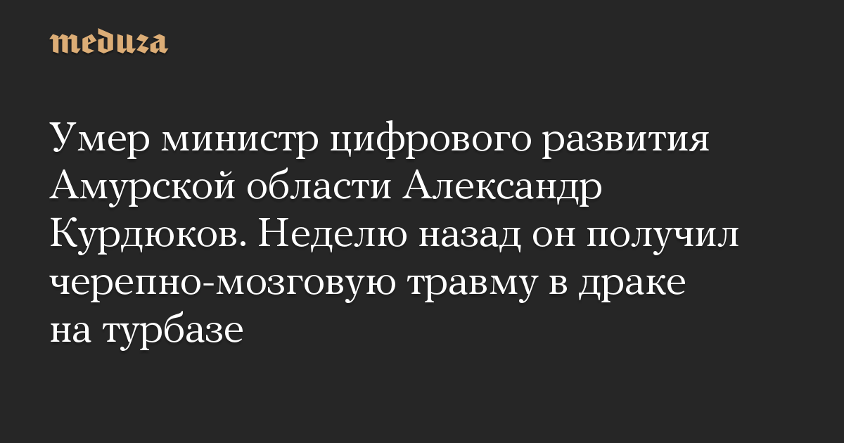 Умер министр цифрового развития Амурской области Александр Курдюков. Неделю назад он получил черепно-мозговую травму в драке на турбазе