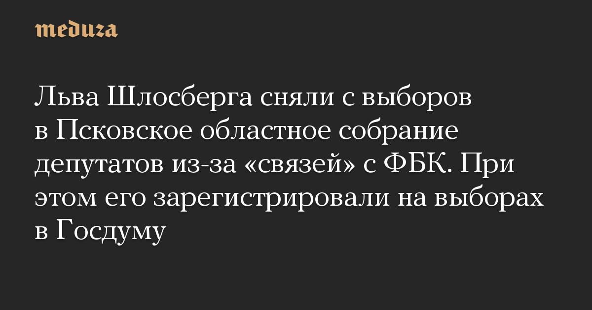 В тот же день, когда Шлосберга сняли с выборов в Псковской области, его зарегистрировали кандидатом в депутаты Госдумы по 207 одномандатному округу.