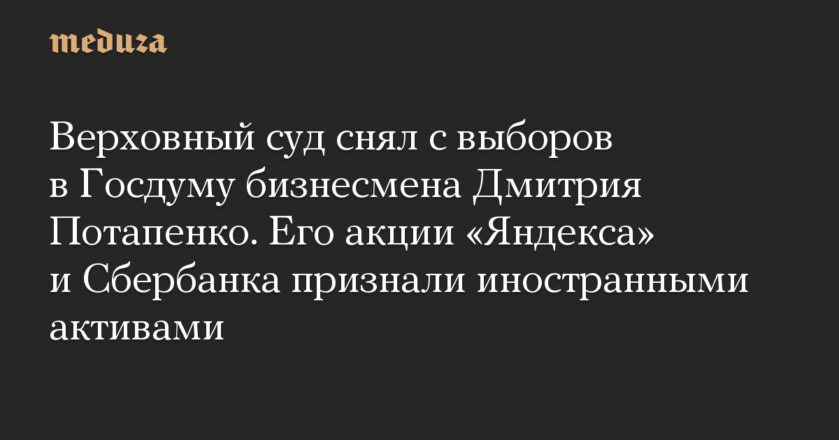 Верховный суд снял с выборов в Госдуму бизнесмена Дмитрия Потапенко. Его акции «Яндекса» и Сбербанка признали иностранными активами