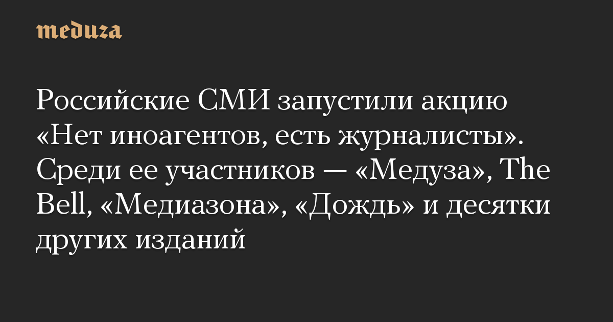 Российские СМИ запустили акцию «Нет иноагентов, есть журналисты». Среди ее участников — «Медуза», The Bell, «Медиазона», «Дождь» и десятки других изданий