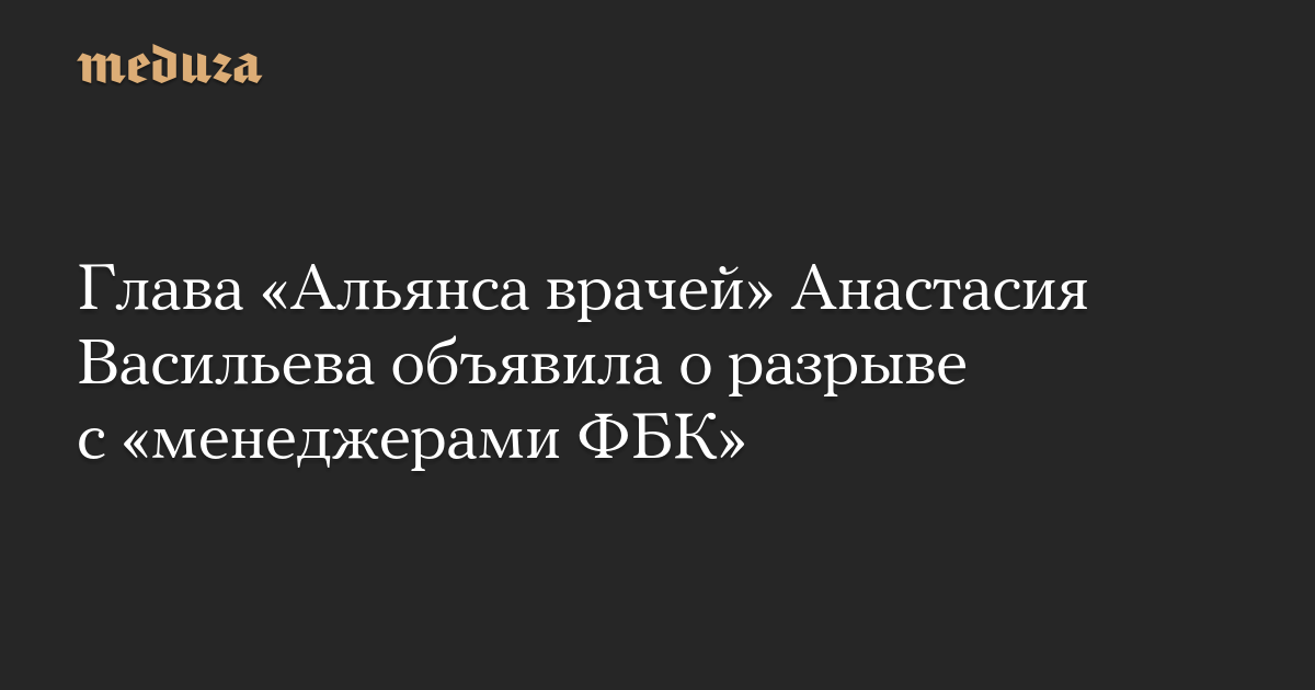 Руководитель «Альянса врачей» Анастасия Васильева обвинила «менеджеров ФБК» в том, что они использовали профсоюз в своих интересах и «забыли» о нем, как только он перестал быть им нужен. Соответствующий пост появился в фейсбуке Васильевой, ее пресс-секретарь подтвердила «Медузе», что пост написан главой «Альянса врачей» и что страница не была взломана.