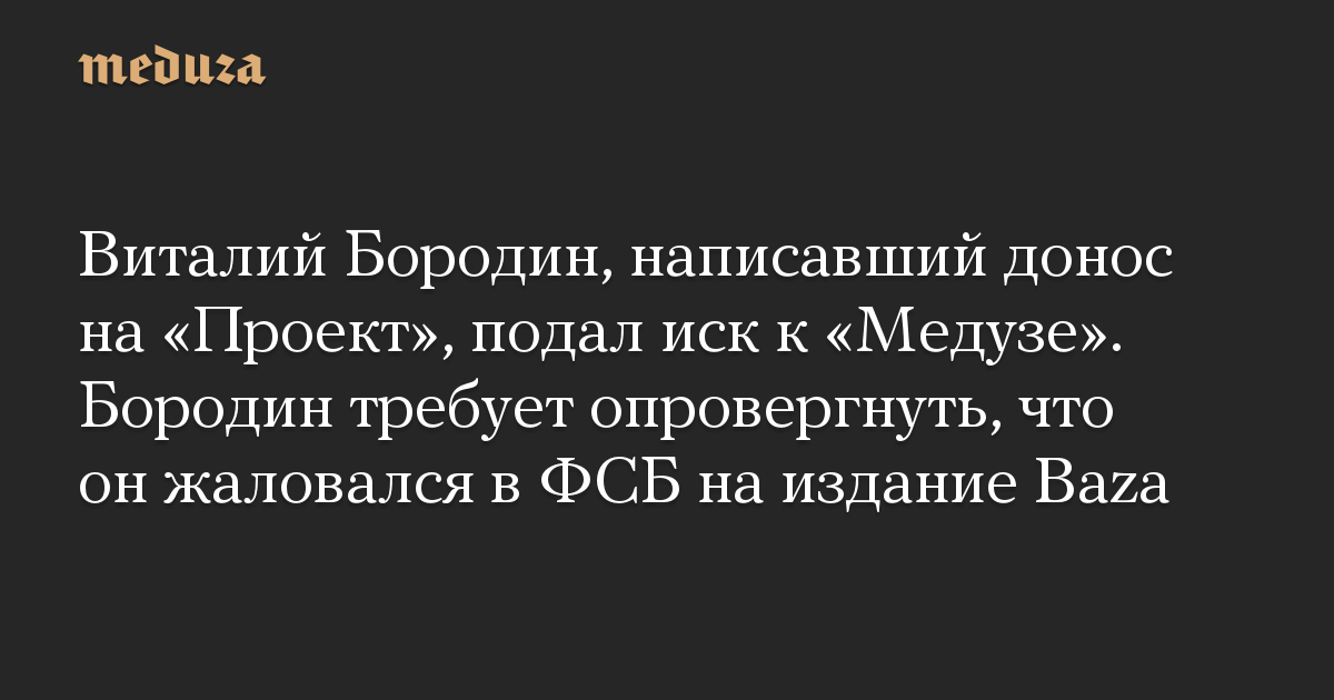Виталий Бородин, написавший донос на «Проект», подал иск к «Медузе». Бородин требует опровергнуть, что он жаловался в ФСБ на издание Baza