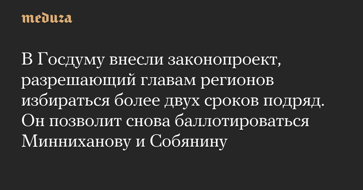 В Госдуму внесли законопроект, разрешающий главам регионов избираться более двух сроков подряд. Он позволит снова баллотироваться Минниханову и Собянину